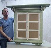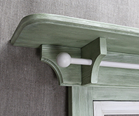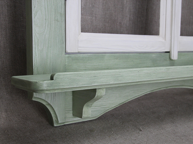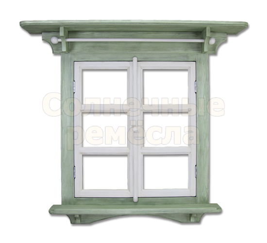 Покраска двойная: внтуренняя рама и перекладина с шариками - белого цвета; наличник, включая полочки и кронштейны - зеленого (цвет "бамбук").