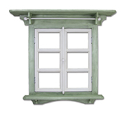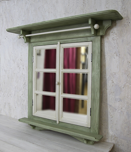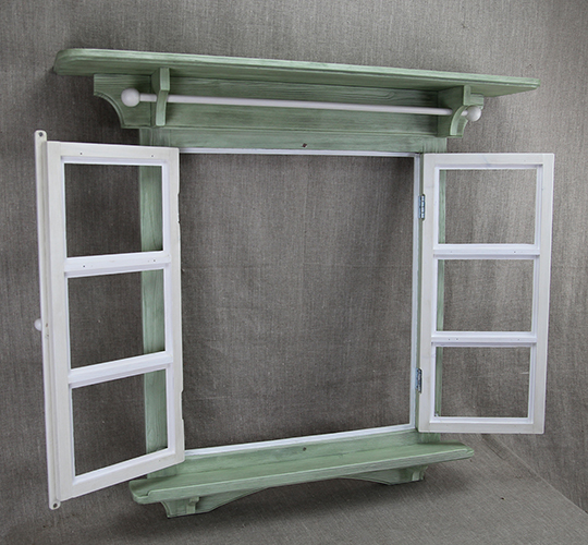 Рама в виде окна с открывающимися створками (см. фото 5) с двумя полочками на кронштейнах и перекладиной с декоративными шариками.