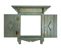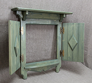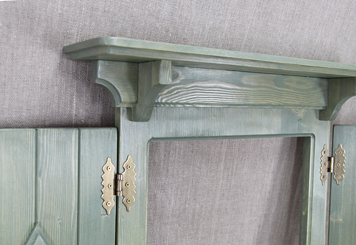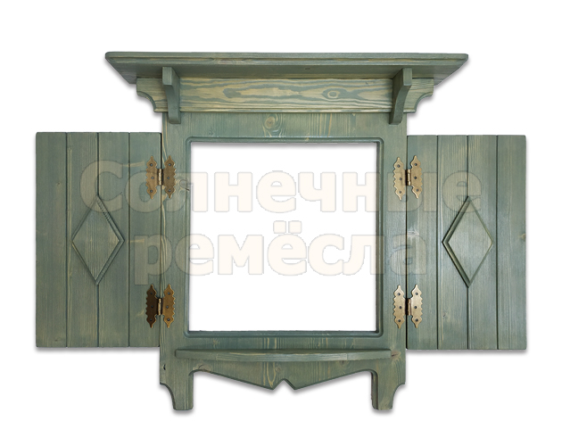 Рама-окно со ставнями и с полочкой выполнена из массива сосны. Рабочая поверхность полочки 12х60 см. Такая полка нужна была заказчику под кашпо с цветами. Ставни - с имитацией досок, с декоративными элементами - ромбами.