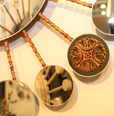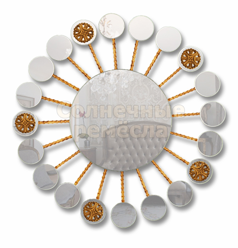Зеркало, висящее на стене, можно поворачивать на любой угол вокруг центра. Зеркало выглядит объемным, т.к. вся зеркальная поверхность отступает от стены на 5 см, благодаря специальной конструкции подвеса.