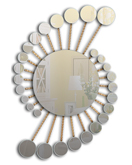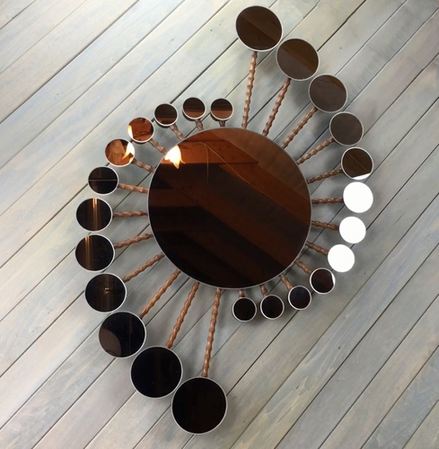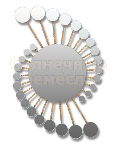 Зеркало, висящее на стене, можно поворачивать на любой угол вокруг центра по часовой стрелке и против часовой. Зеркало выглядит объемным, т.к. вся зеркальная поверхность отступает от стены на 5 см, благодаря специальной конструкции подвеса.